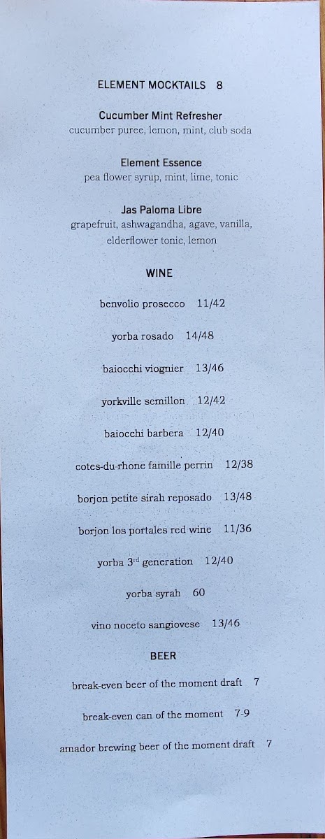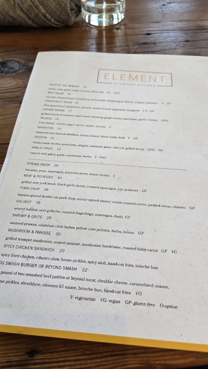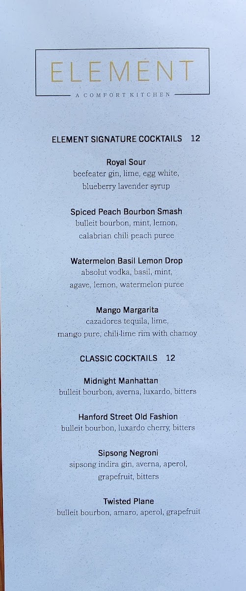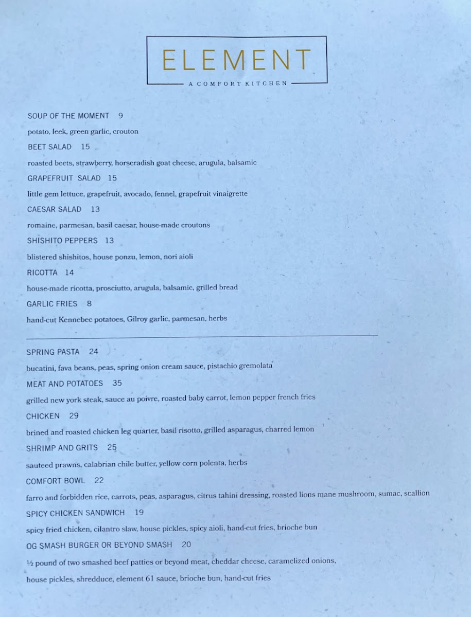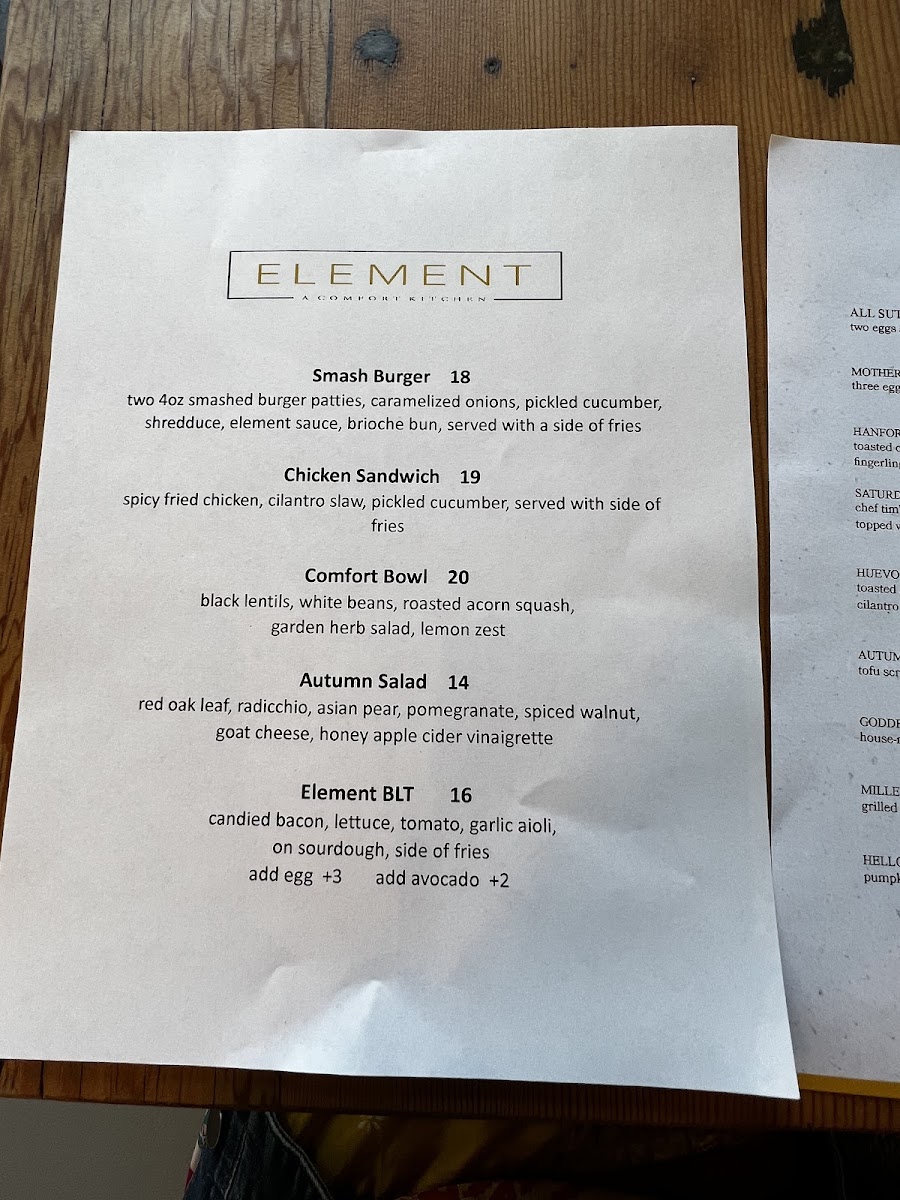 The menu pairs well with carefully prepared beverages ranging from a classic Element Bloody Mary or Mocha to a warm cup of Hot Chocolate, making it an easy spot for starting the day or unwinding in the evening. Lighter bites like the Soup of the Moment and Shishitos fit nicely into a laid-back lunch or as starters to share, while desserts such as the Chocolate Torte with Fresh Berries offer a subtle, satisfying finish.