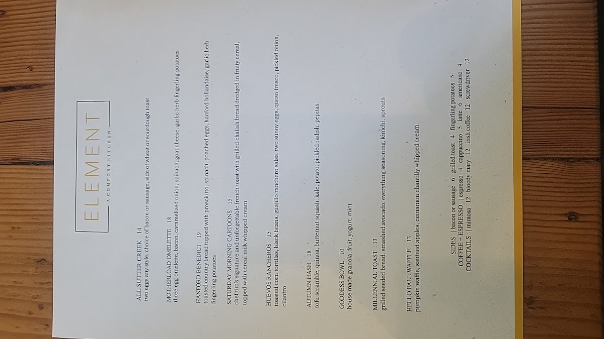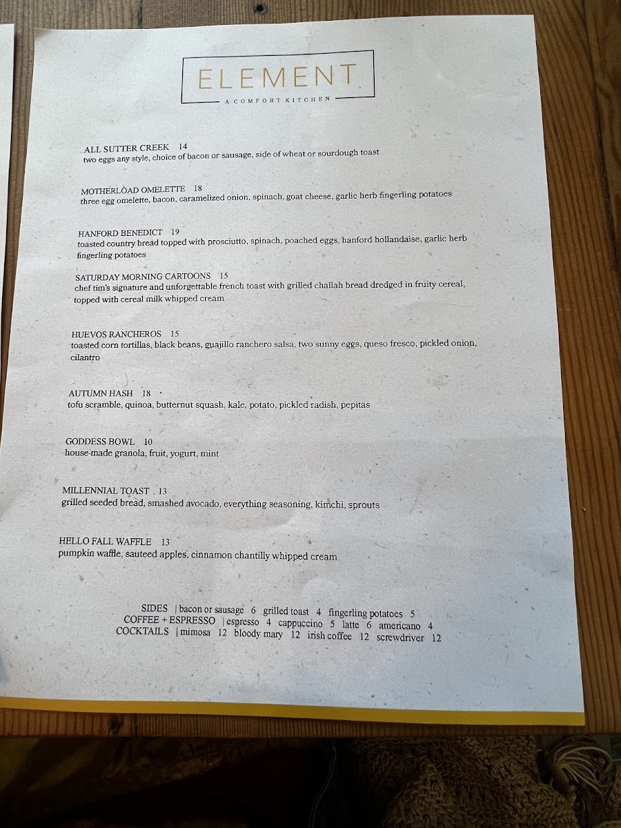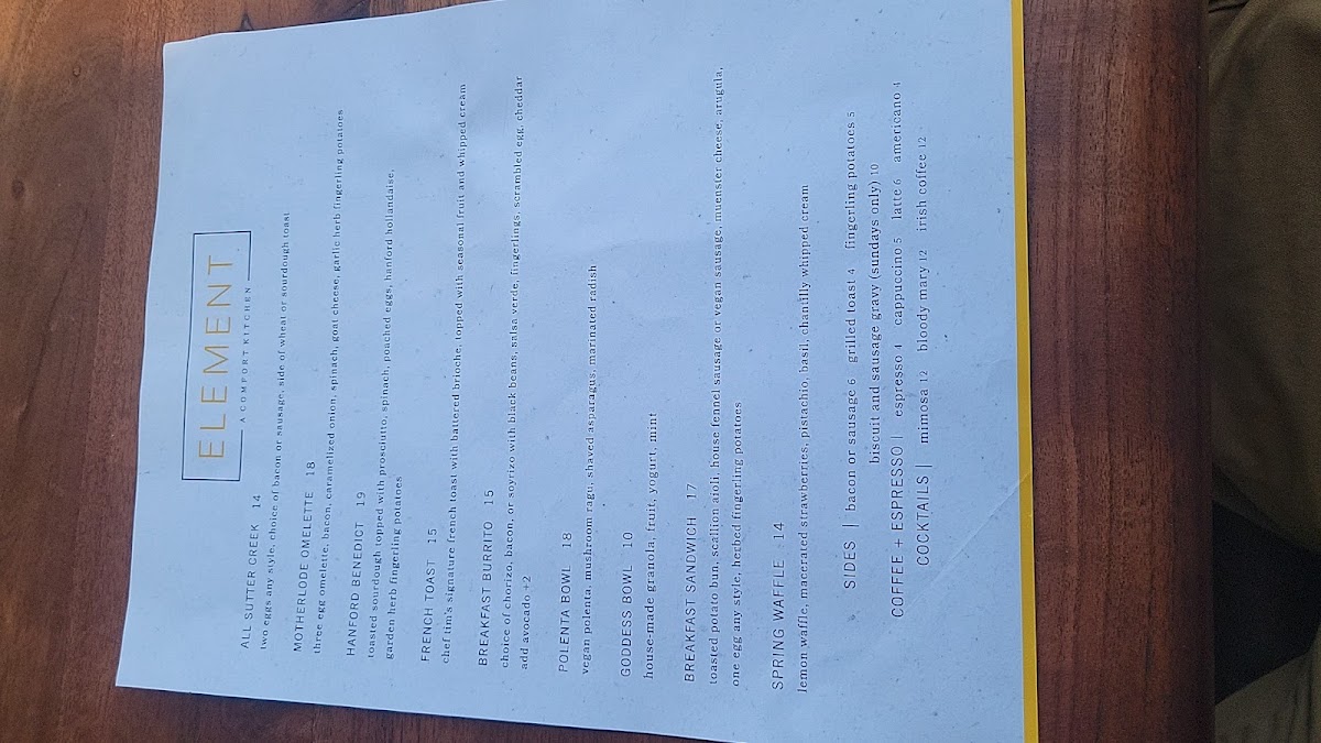 Element offers a thoughtfully crafted menu that balances approachable New American dishes with comforting and creative touches. The selection feels just right for savoring a relaxed breakfast, brunch, or a casual dinner in the inviting setting of Sutter Creek. From morning staples like the Hanford House Benny Benedict and Breakfast Tacos to heartier fare such as the Og Smash Burger and Baked Chicken, there’s a thoughtful harmony between familiar flavors and a modern twist.